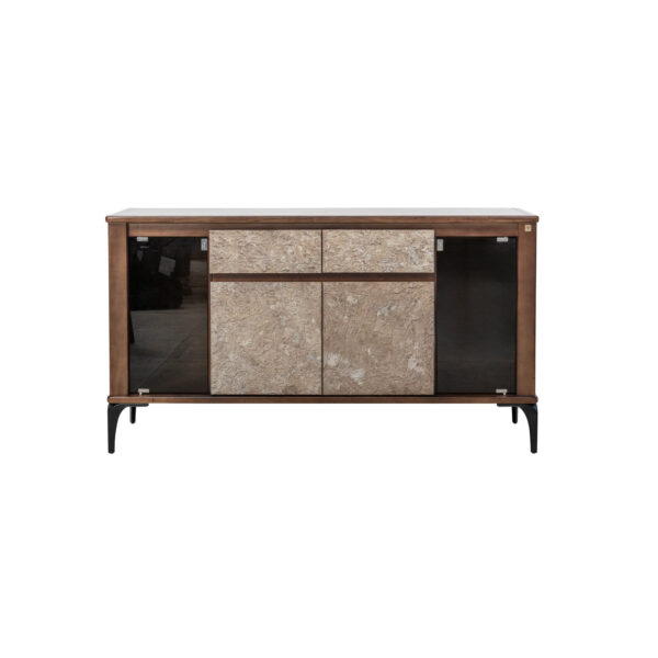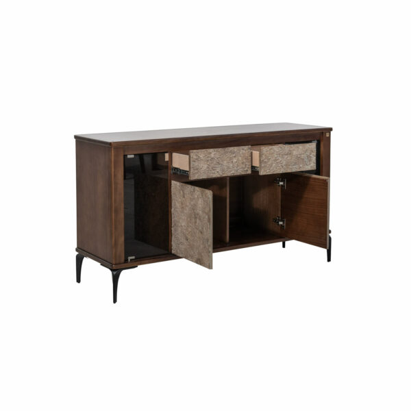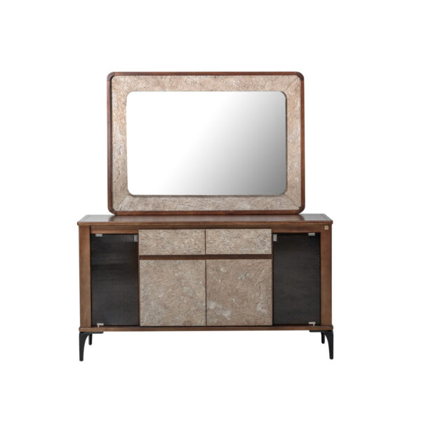 ACABADOS CON LACA POLIURETANICA LIBRE DE PLOMO, APLIQUE DE PIEDRA, PATAS METALICAS, MADERA DE TECA, TABLERO MDF Y MDP MARFIL , TABLERO MDF, VIDRIO BRONCE, VIDRIO CLARO |