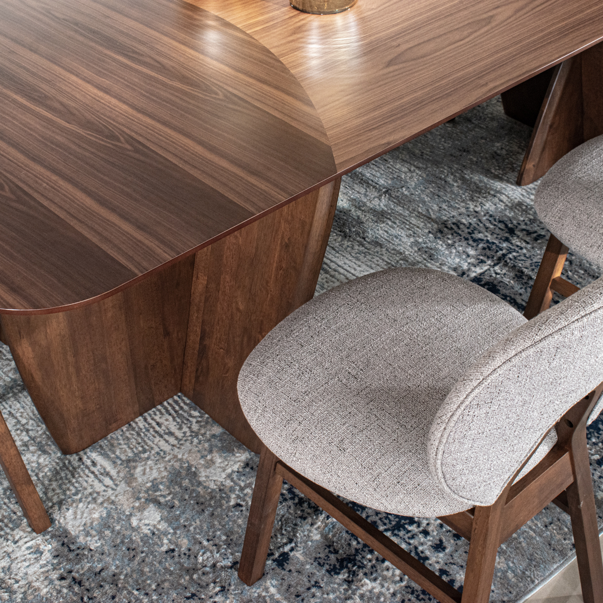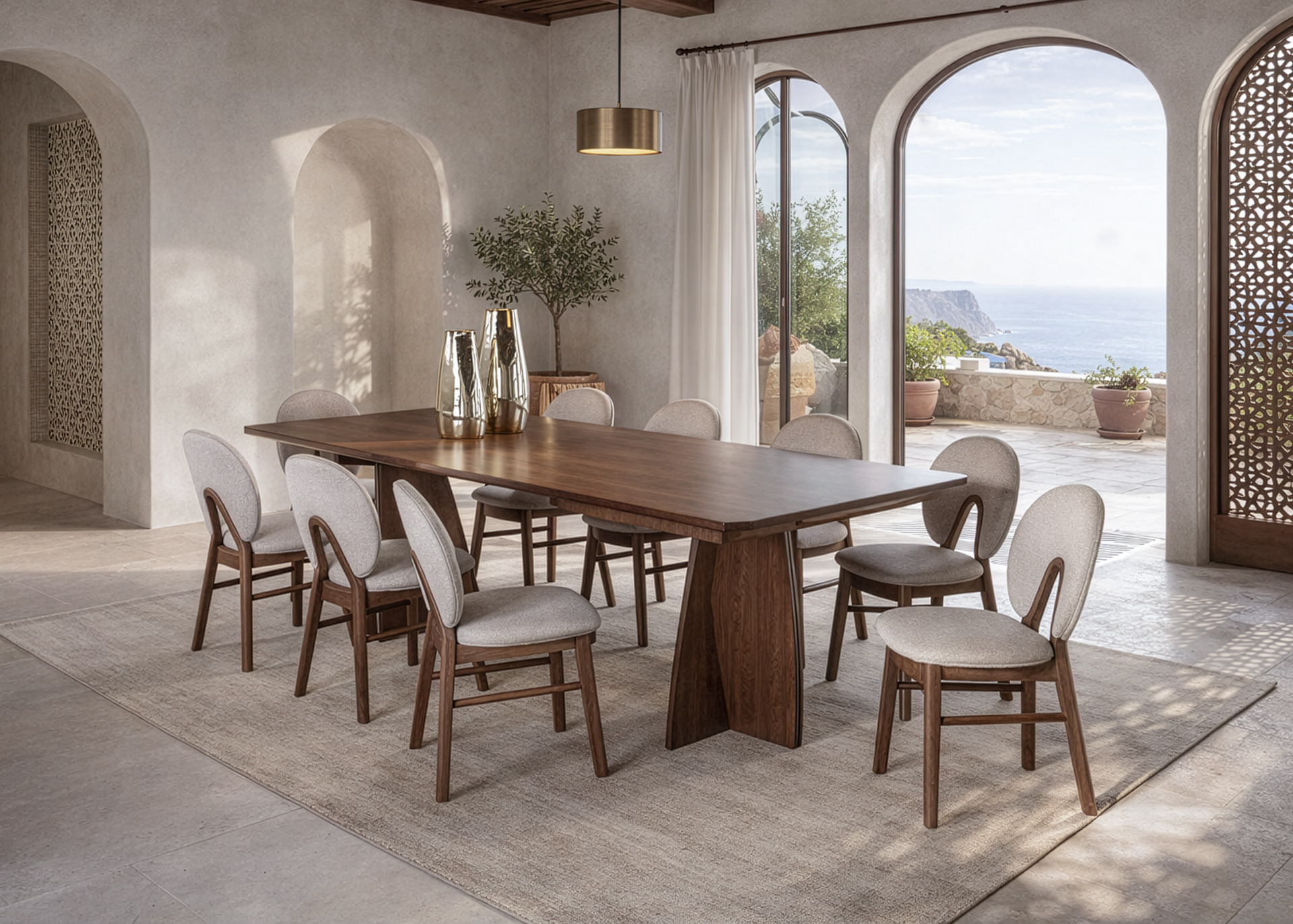 Inspirada en su herencia andaluza y sus tonos arena, este comedor de 8 puestos combina madera walnut profunda con tapices beige suaves que evocan calma y sofisticación mediterránea. Granada no es rígida: es fluida, acogedora, envolvente. Sus volúmenes y texturas transmiten hogar, cercanía y diseño con alma. Una colección que conecta tradición y modernidad con una elegancia natural.
