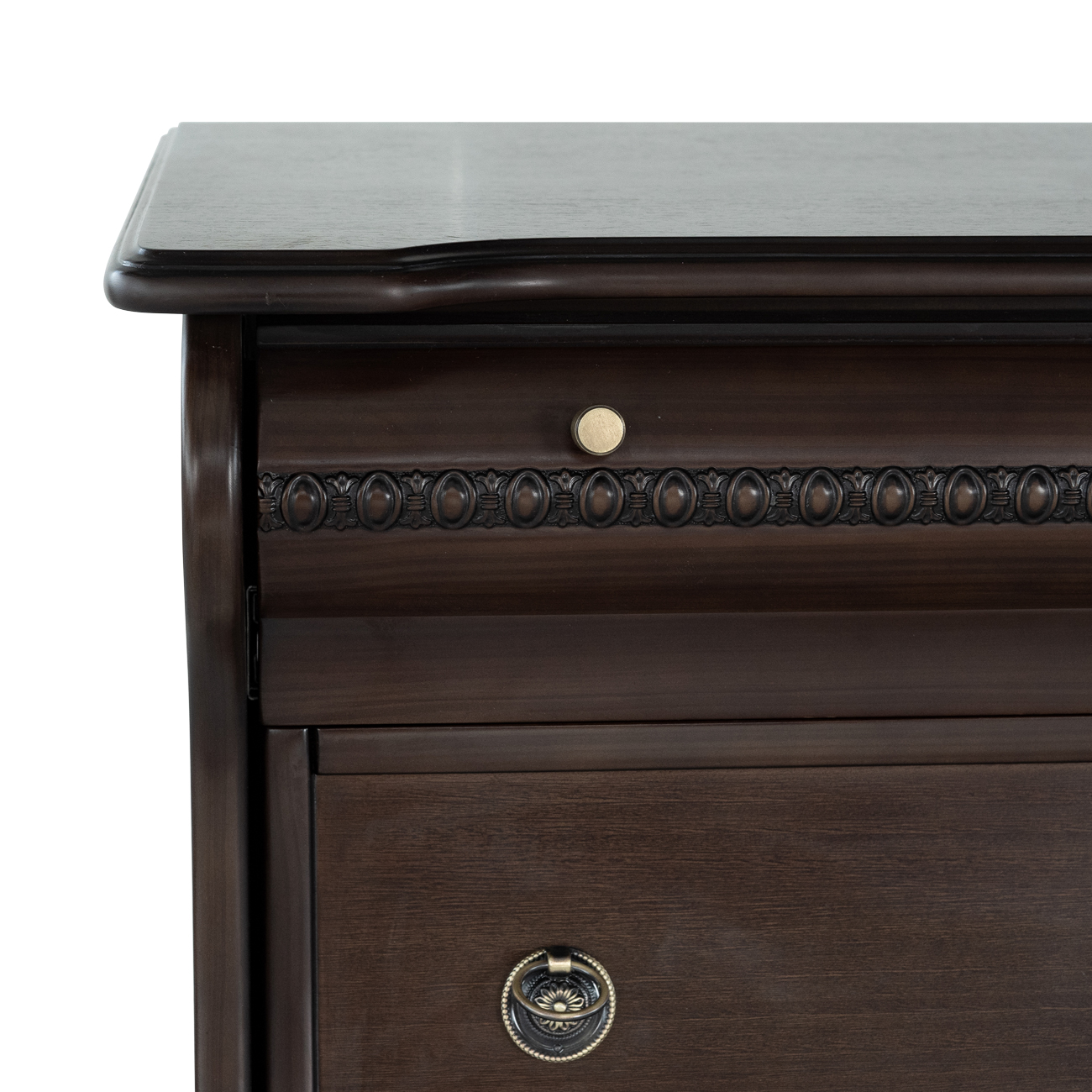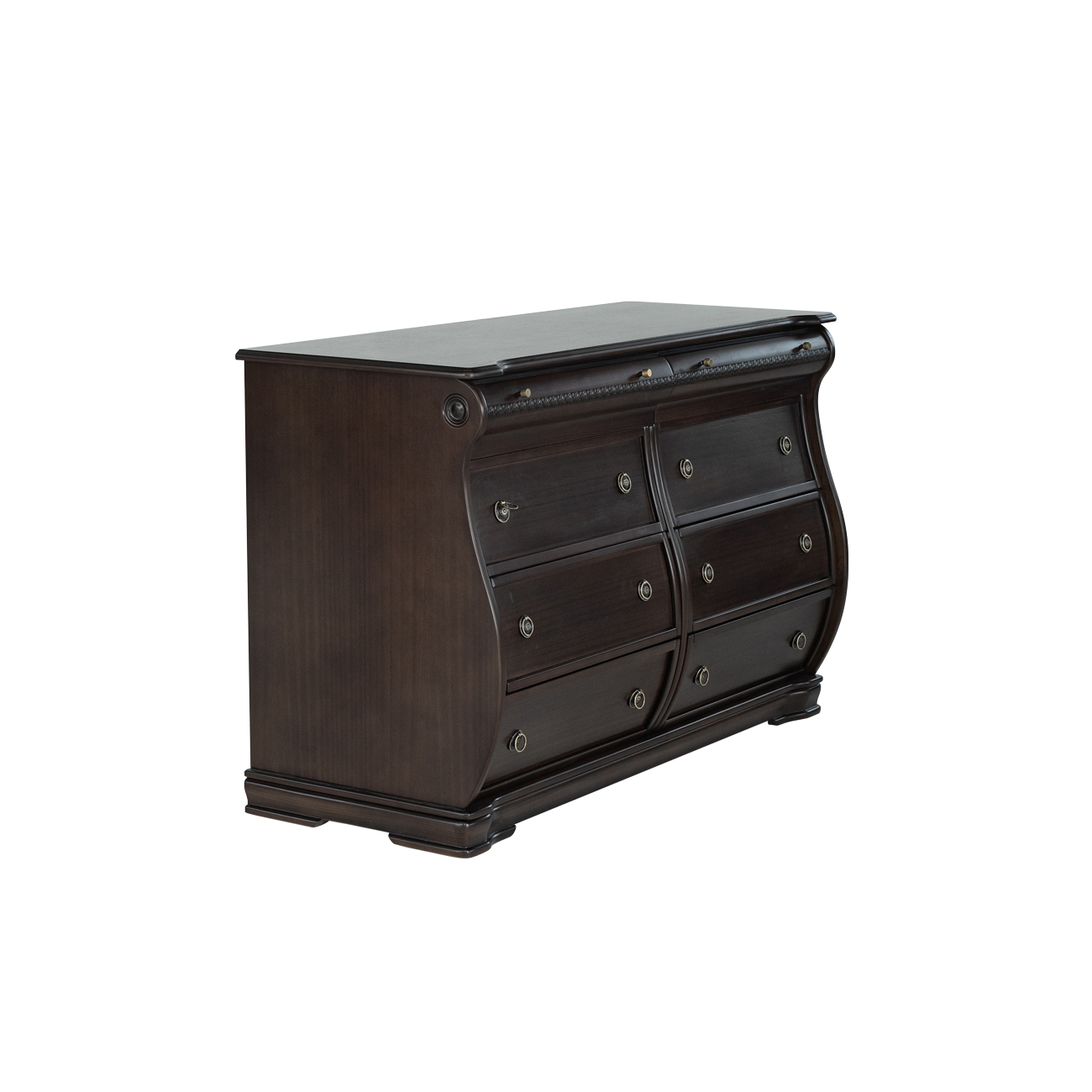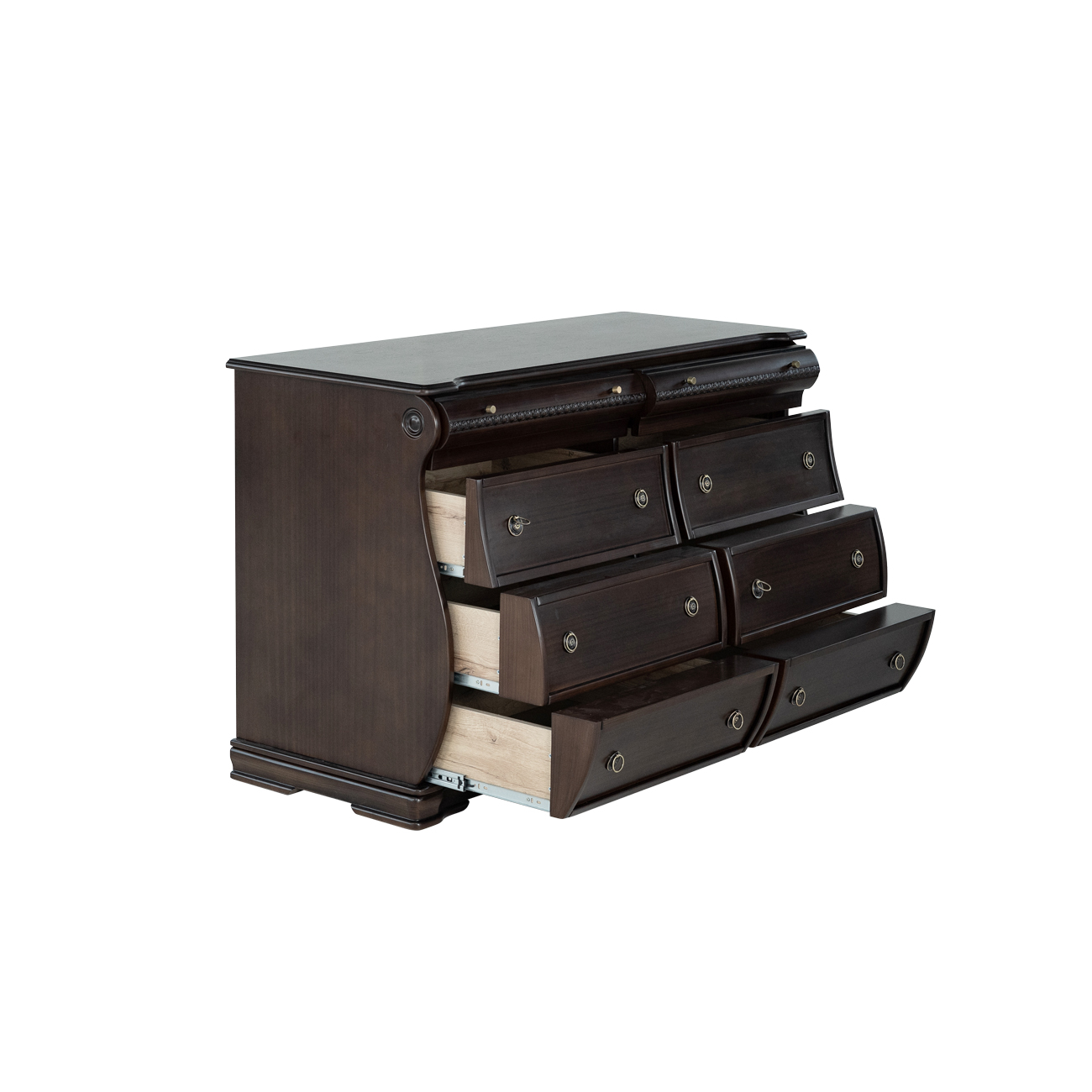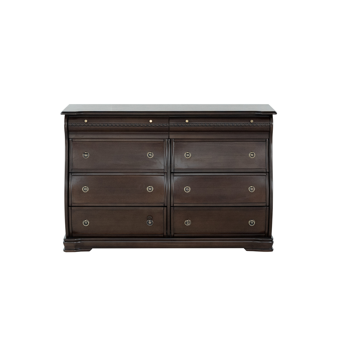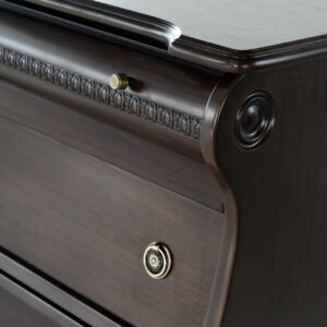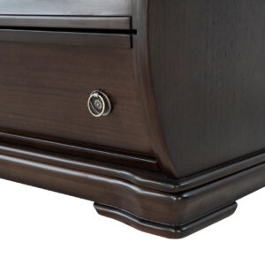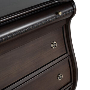 Esta cómoda de estilo clásico americano, fabricada en madera de pino con un elegante acabado, destaca por su diseño sofisticado y funcional. Con seis amplios cajones, adornados con tiradores de metal, ofrece una solución perfecta para almacenar ropa, mantas o sábanas. Sus detalles curvados y molduras decorativas evocan el encanto de los muebles antiguos, lo que la convierte en una pieza ideal para dormitorios, salones o recibidores. Su robusta construcción en madera garantiza durabilidad, mientras que su tono marrón oscuro añade un toque refinado a cualquier espacio del hogar.