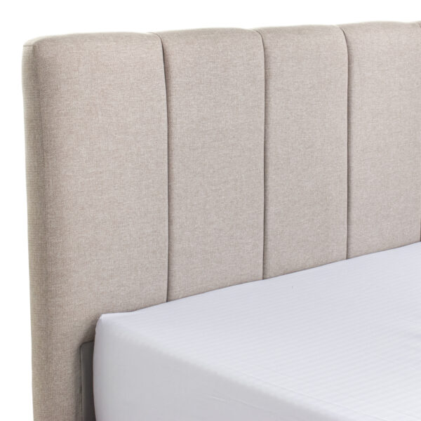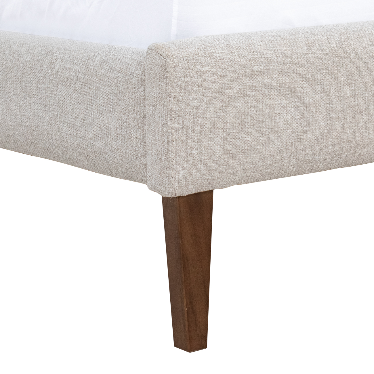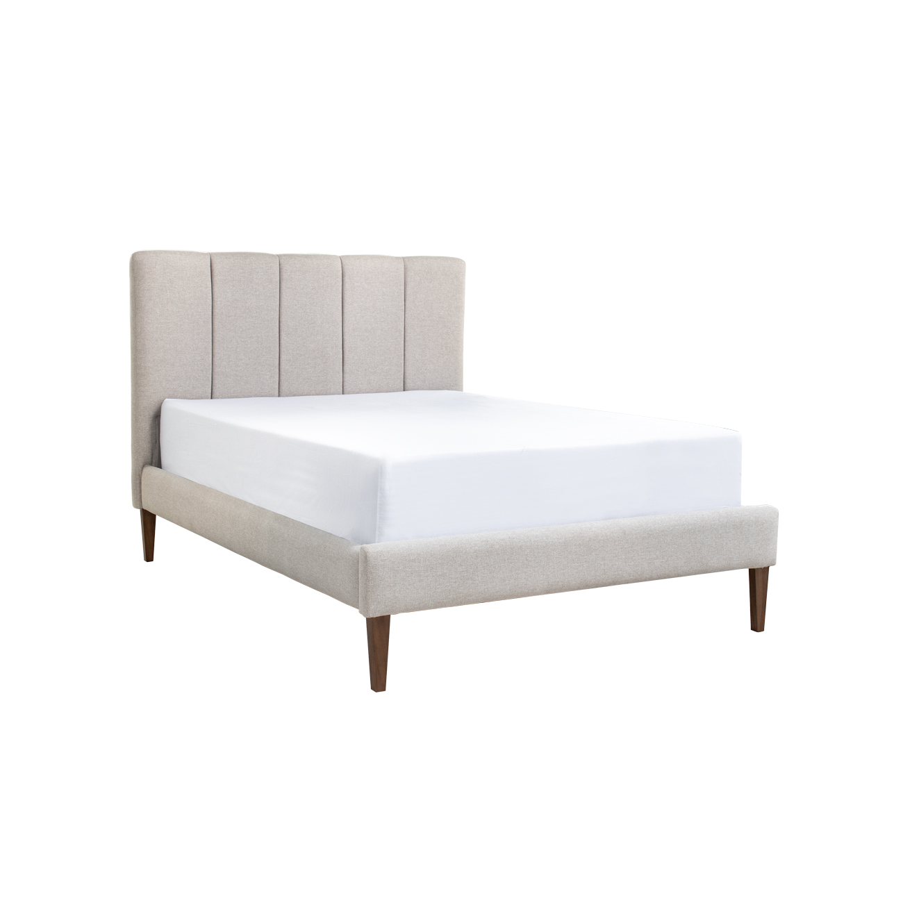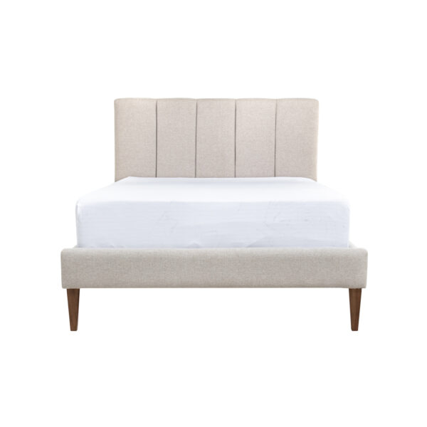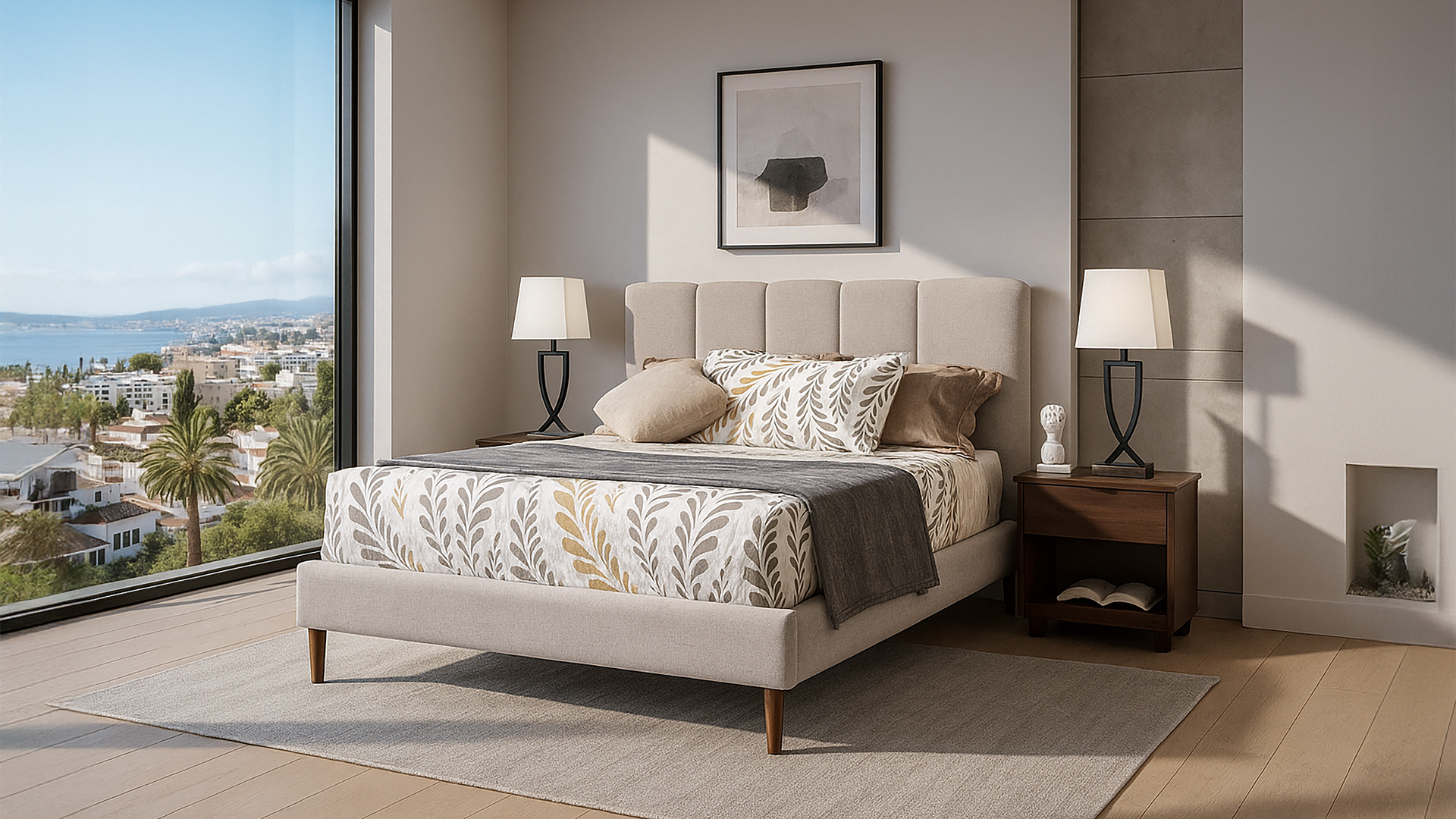 Esta cama de estilo contemporáneo y minimalista sobresale por su distinguida cabecera alta, fabricada con tapices exclusivos que combinan elegancia y confort. Los paneles acolchados verticales aportan una dosis de sofisticación, mientras que la estructura, de líneas rectas y depuradas, resalta su diseño limpio y sobrio. Las patas de madera elaboradas en guayacan de alta calidad, ofrecen un detalle cálido que equilibra su apariencia moderna y elevada, proporcionando a la cama una ligereza visual. Este modelo no solo es una elección estética, sino también funcional, ideal para cualquier dormitorio que busque un toque contemporáneo y acogedor, adaptándose a diversos estilos decorativos, desde los más minimalistas hasta los más variados.
