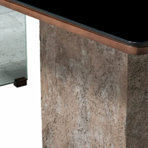 - Material de las patas de mesa: Base de madera y tablero de MDP cubierto por travertino cultivado y parante costado de vidrio laminado claro.