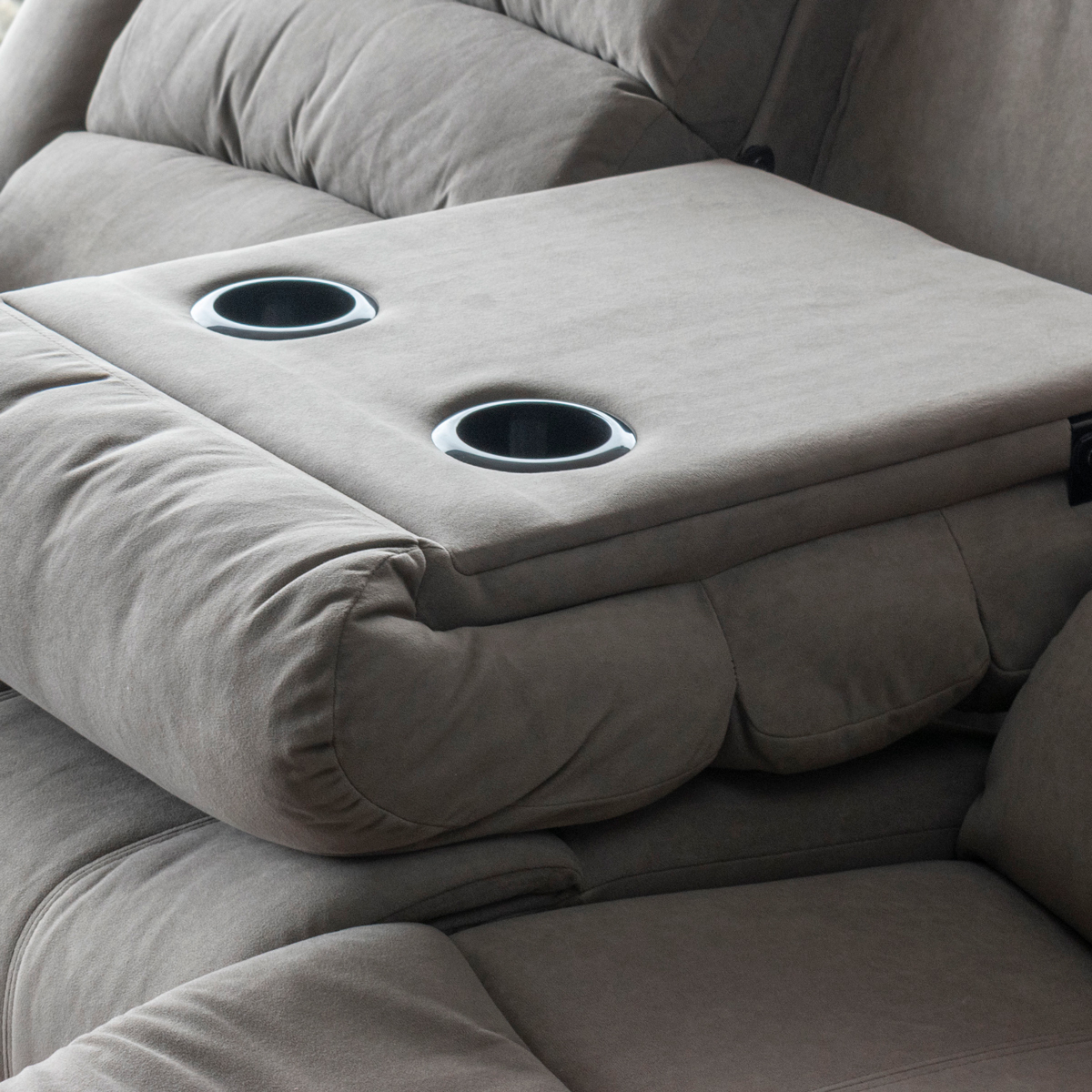 El asiento central incorpora una mesa abatible, ideal para apoyar bebidas, snacks o dispositivos, aportando funcionalidad sin comprometer el diseño. Su acolchado profundo, respaldos ergonómicos y apoyabrazos amplios garantizan una experiencia de descanso superior.